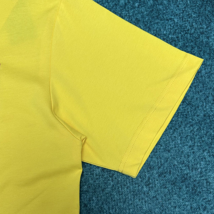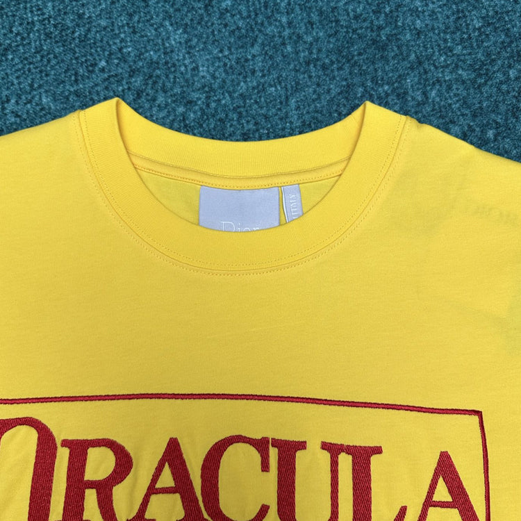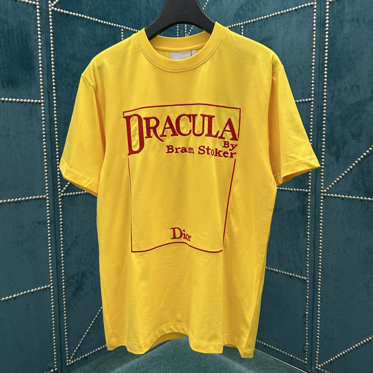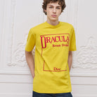 Yellow and red cotton plain knit fabric Book Cover pattern embroidery This T-shirt is a classic item from Jonathan Anderson's Dream Library collection, showcasing Bram Stoker ™) The first cover of the work 'Dracula' pays tribute to literary classics. Crafted with yellow and red cotton plain knit fabric, the book cover is embroidered on the front. Can be easily paired with various types of pants or jeans to create a fashionable and modern style.
