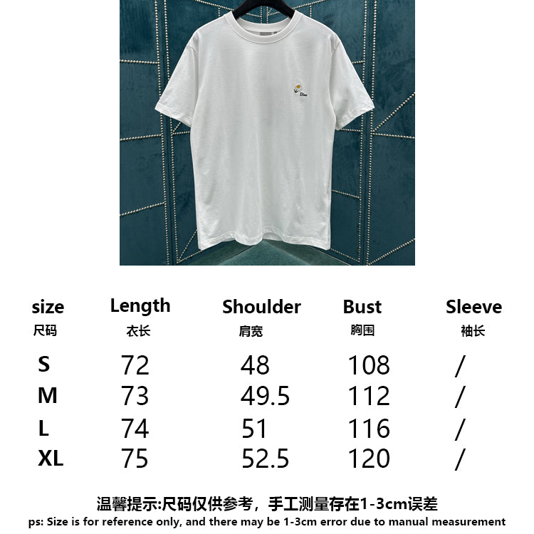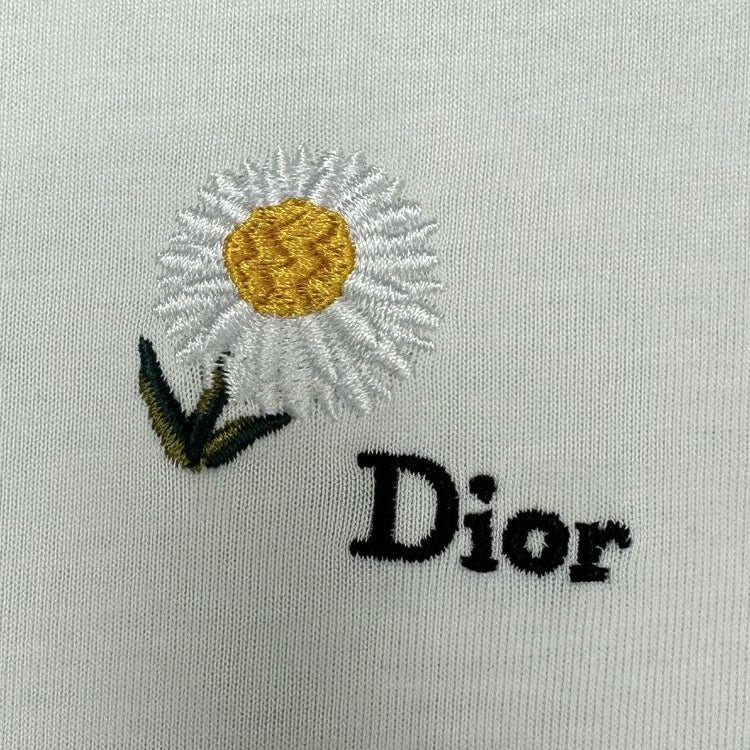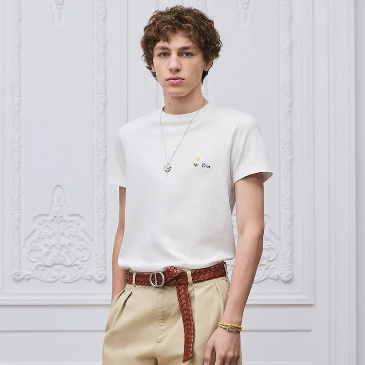 This T-shirt with white cotton plain weave knitted fabric and daisy embroidery is a new product in the 2026 summer men's clothing series, paying tribute to Mr. Dior's love for flowers. Crafted with white cotton plain knit fabric, embellished with daisy embroidery, and paired with Dior logo to enhance the style. Can be paired with shorts to create a casual look.