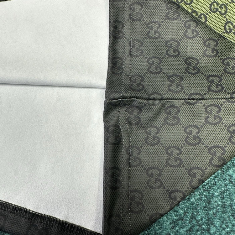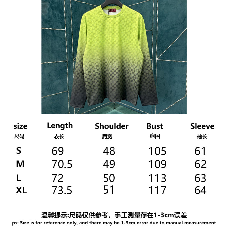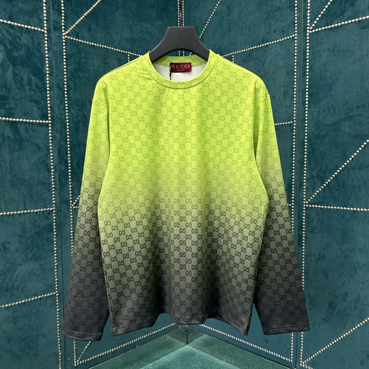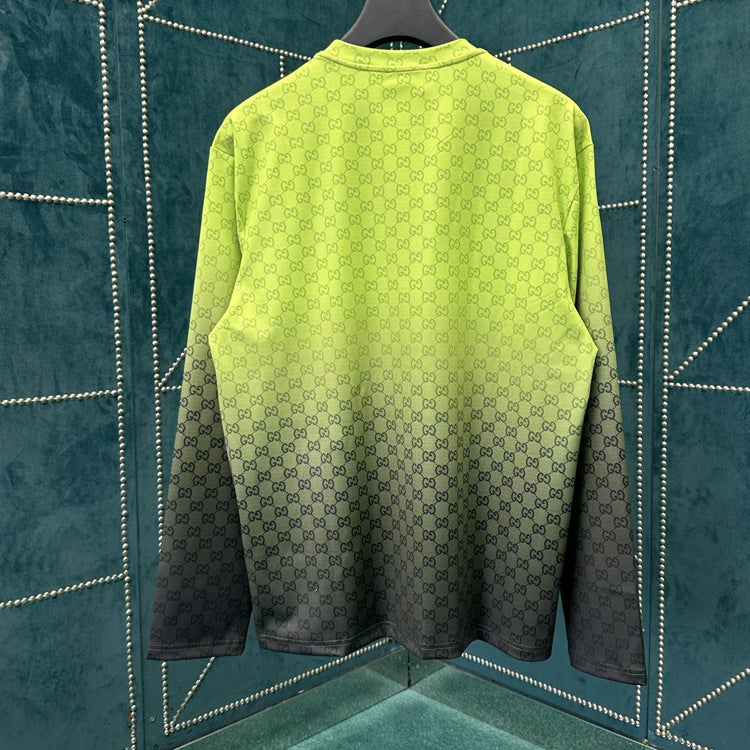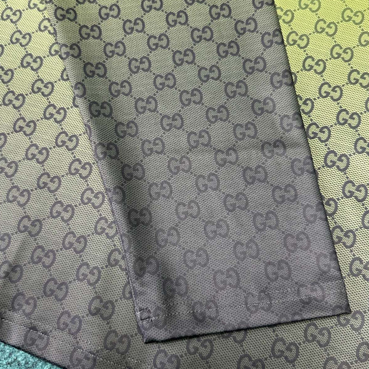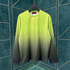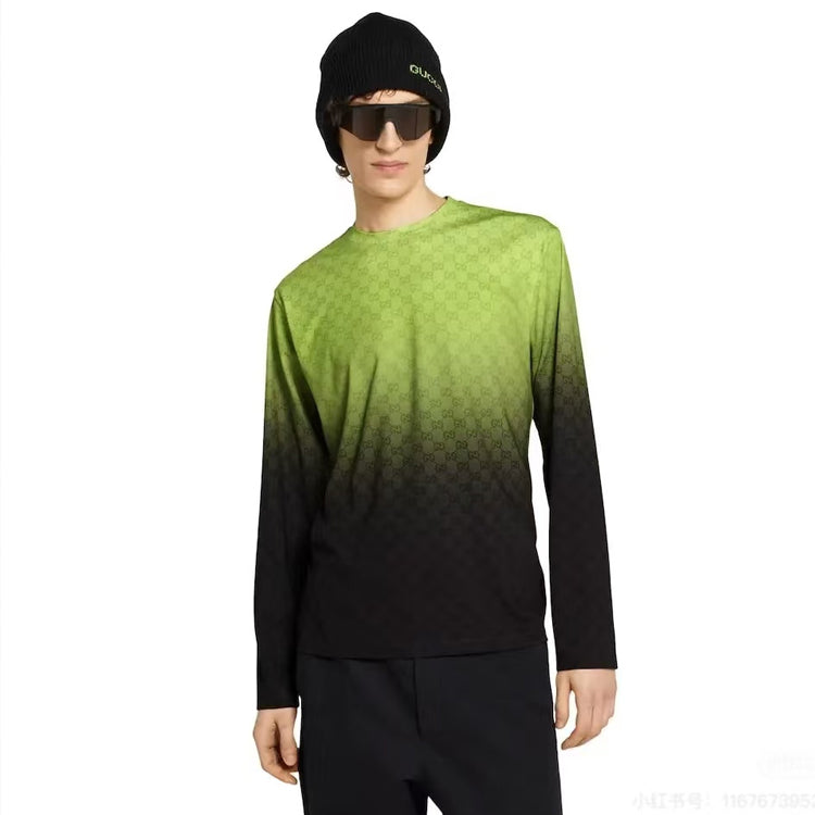 The brand presents multiple gradient color schemes, aiming to highlight the texture of the fabric and the distinctive GG pattern. This T-shirt is made of lemon green to black gradient plain knit cotton, embellished with gradient effect GG print throughout, showcasing a unique charm.