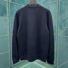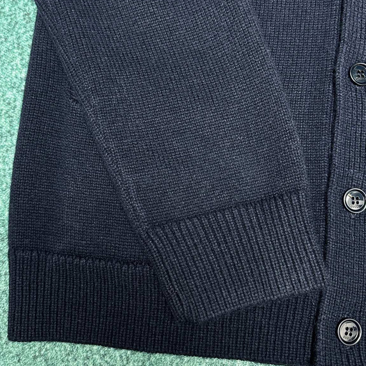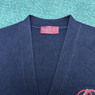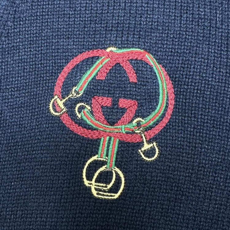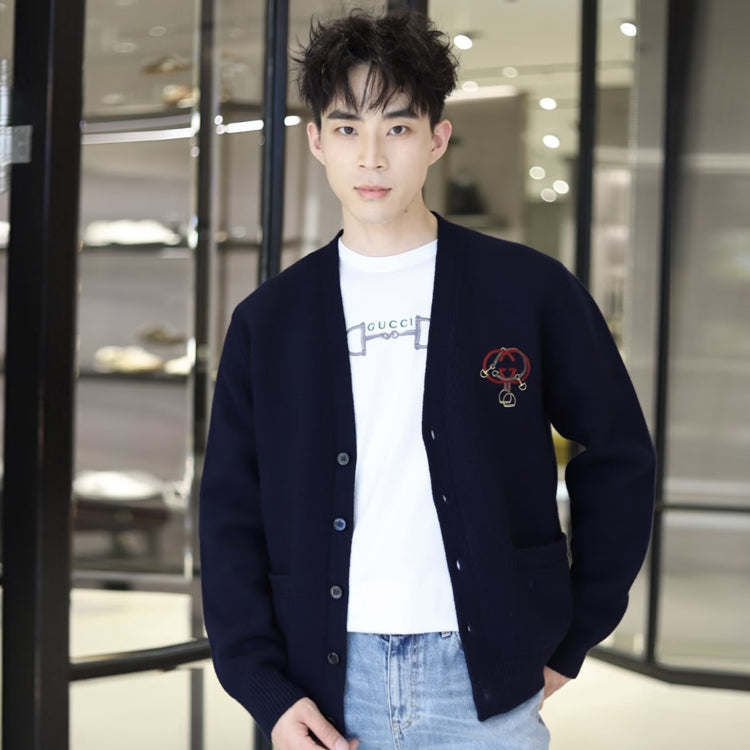 Equestrian style elements are ingeniously embellished with classic silhouettes, adding vitality and style. This cardigan is crafted from deep blue knitted wool, paired with interlocking double G straps and stirrup embroidery, adding a touch of fashion charm.
