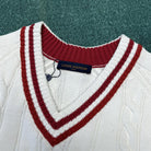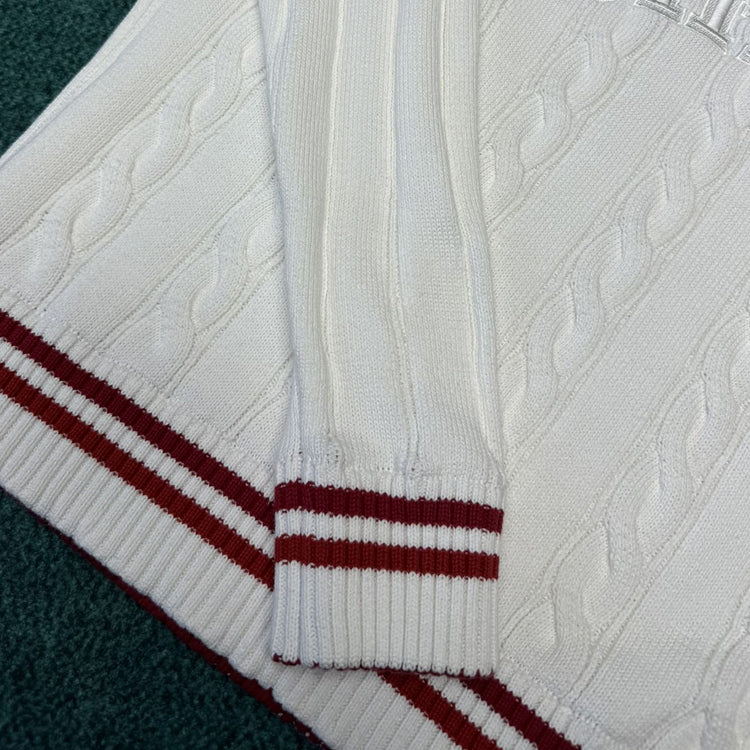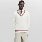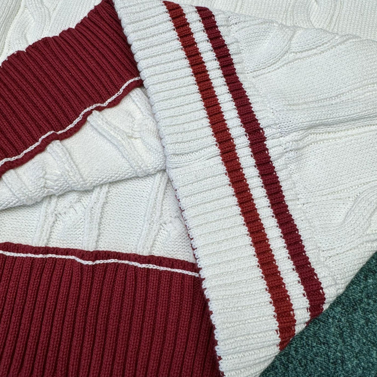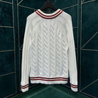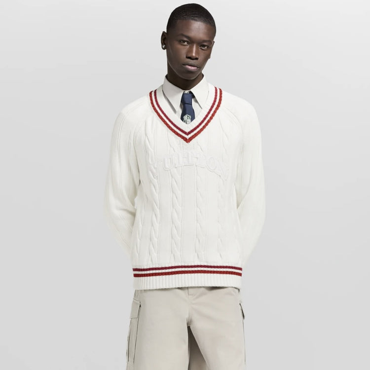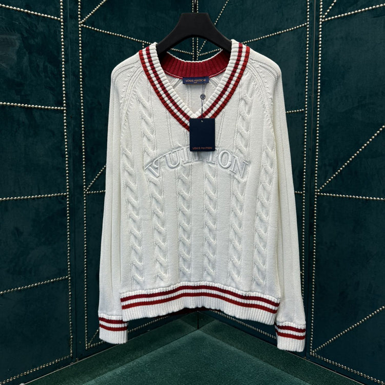 This V-neck pullover is made of thick twisted knit fabric with a plain and elegant color scheme, featuring eye-catching contrasting stripes on the collar, cuffs, and hem. Vuitton embossed embroidery patches light up the chest, allowing various styles to showcase the academic style.