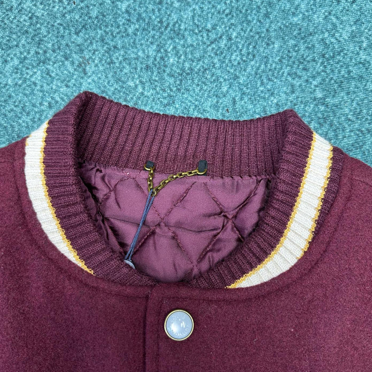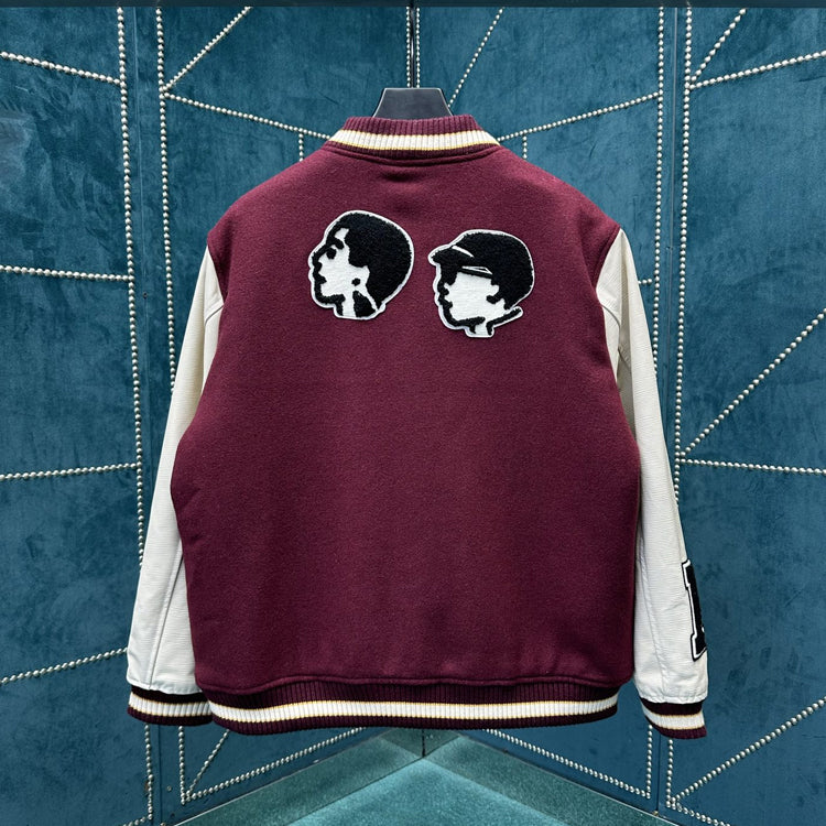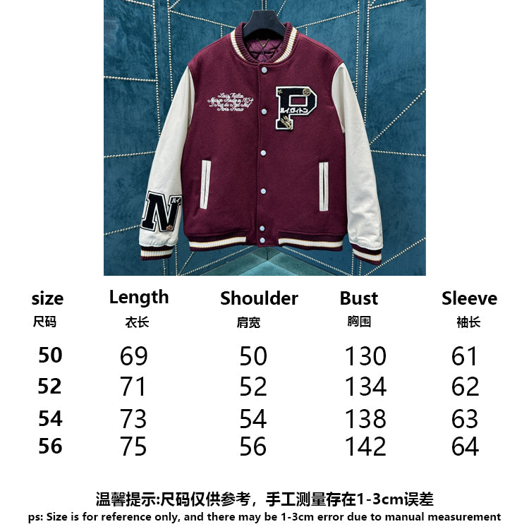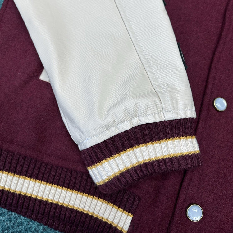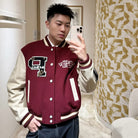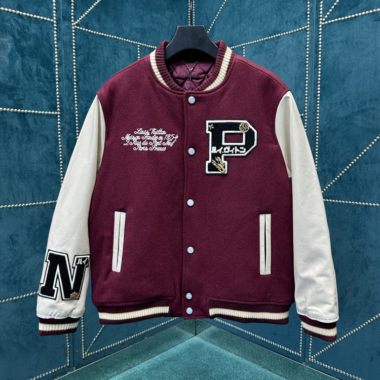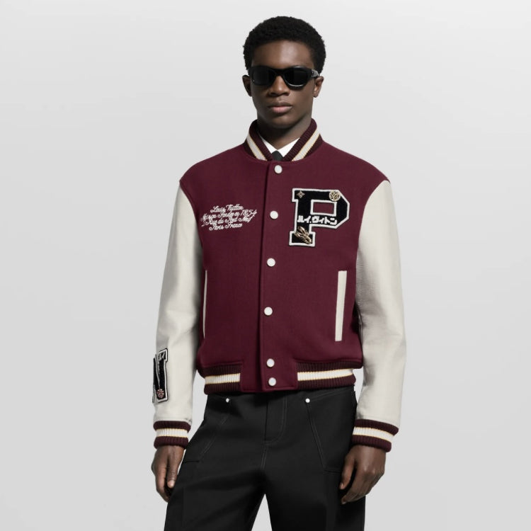 This baseball jacket features a sheep sweater body dyed in rich colors, paired with elegant Epi grain leather sleeves and pockets, making a striking debut in the 2025 autumn/winter collection created by Pharrell Williams and Nigo. The sheep wool pearl leather patch incorporates Japanese embroidery and a jewel like logo decoration, paying tribute to the two designers with the letter P on the chest and the letter N on the right sleeve, complementing the portrait patch at the back. Quilted lining and pearl buttons complement the overall design. Only customizable.