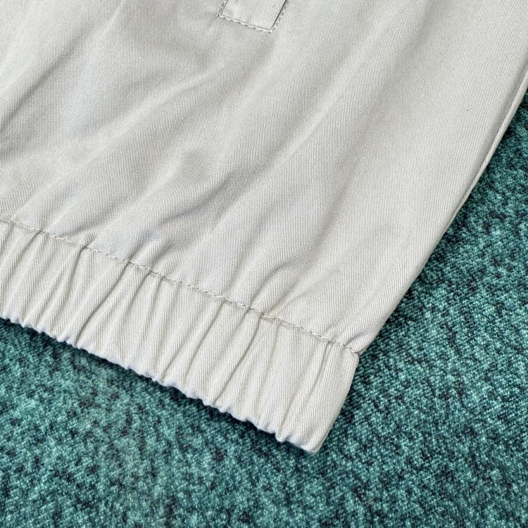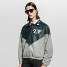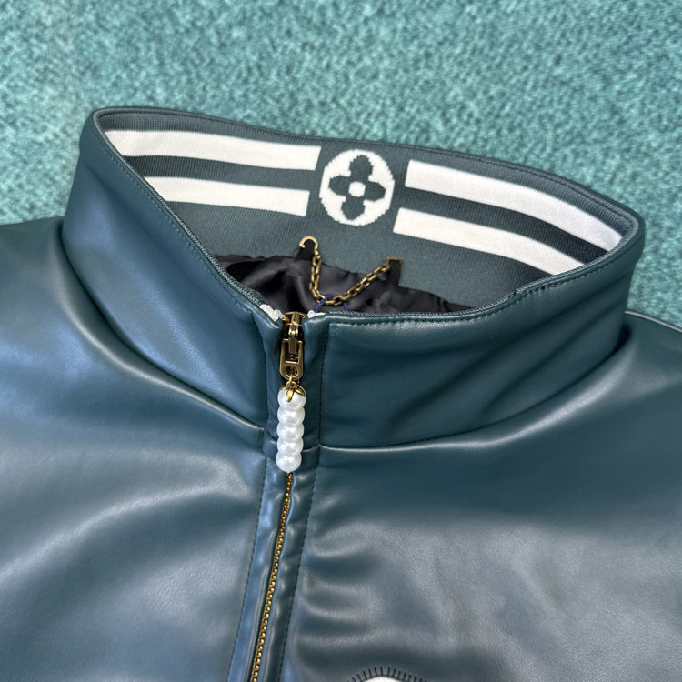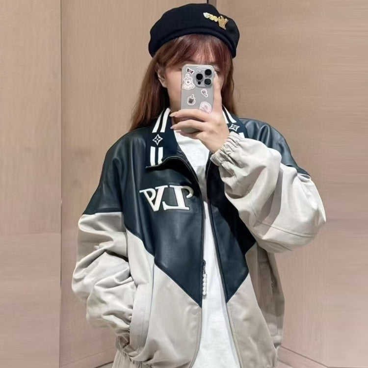 Continuing the inspiration stroke of the new season's American college style theme, the sharp edged yoke of the upper part is presented in glossy leather, creating a sharp contrast with the simple and elegant nylon blend of the lower part. The elastic hem and cuffs showcase functional considerations, while the collar features a prominent logo and the beaded zipper adds another touch of elegance.