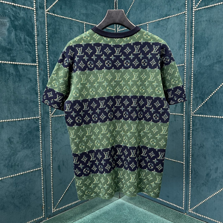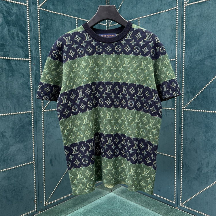 This short sleeved round neck shirt features a full Monogram Heritage pattern that traces back to the baseball theme, injecting a college vibe into daily styling. Color blocking horizontal stripes integrated with misalignment 3D effect Monogram elements, exquisite jacquard craftsmanship interprets traditional sports style