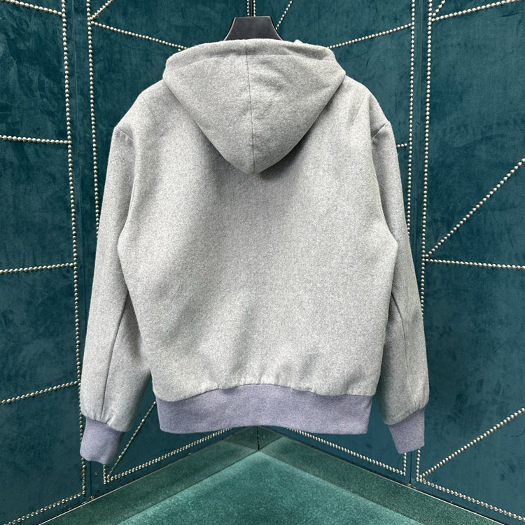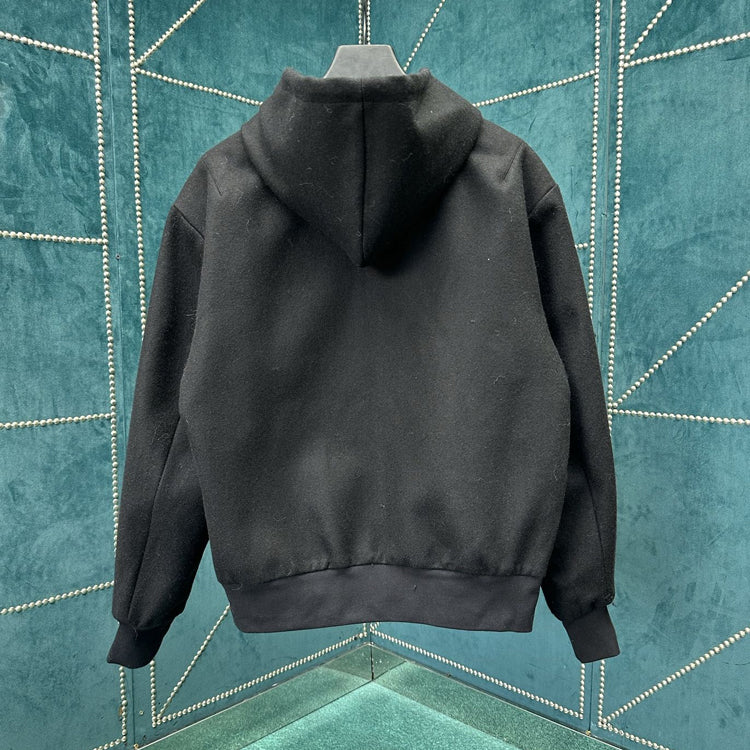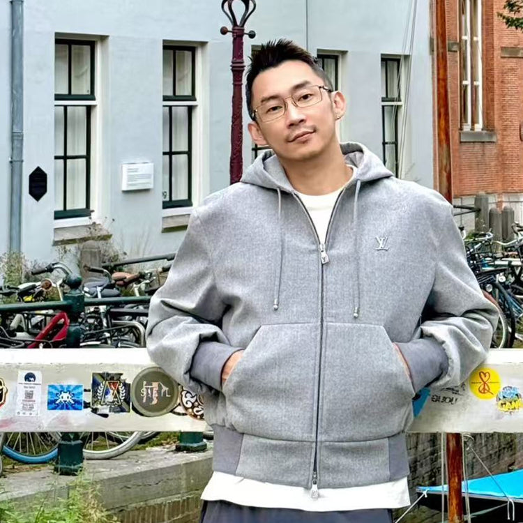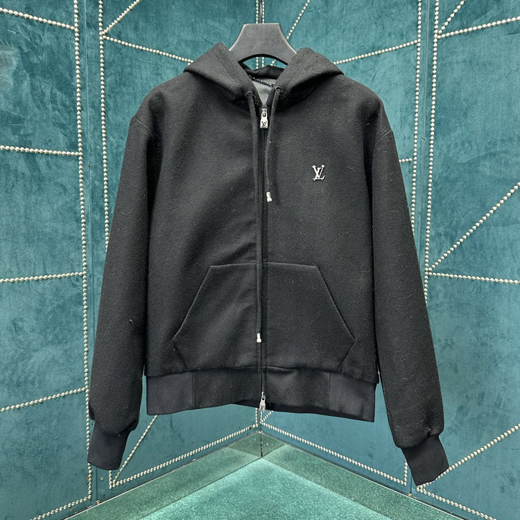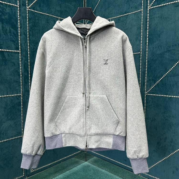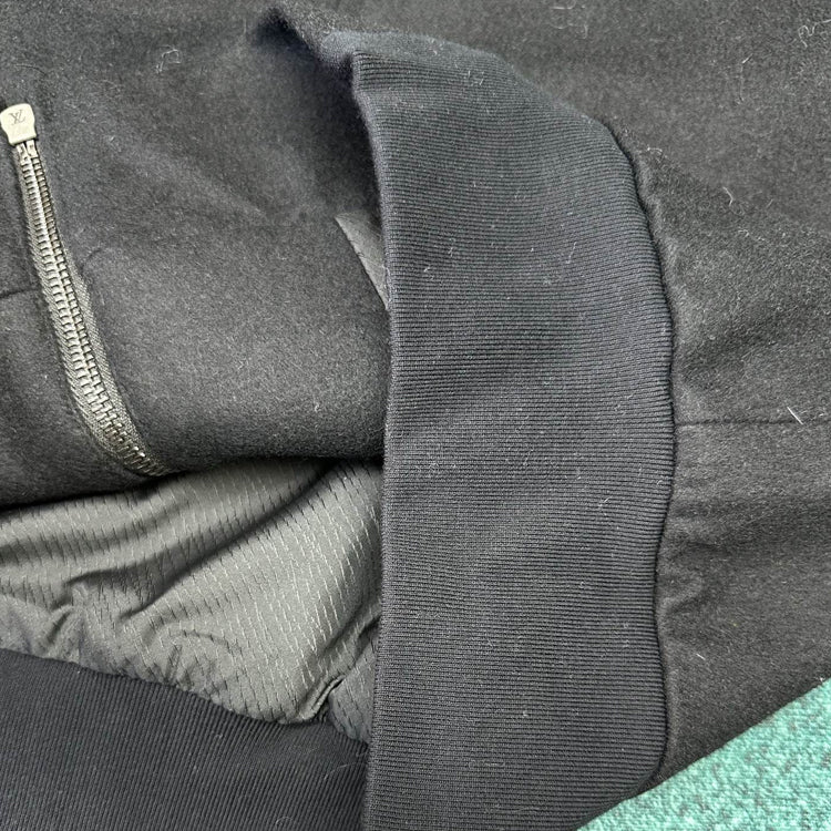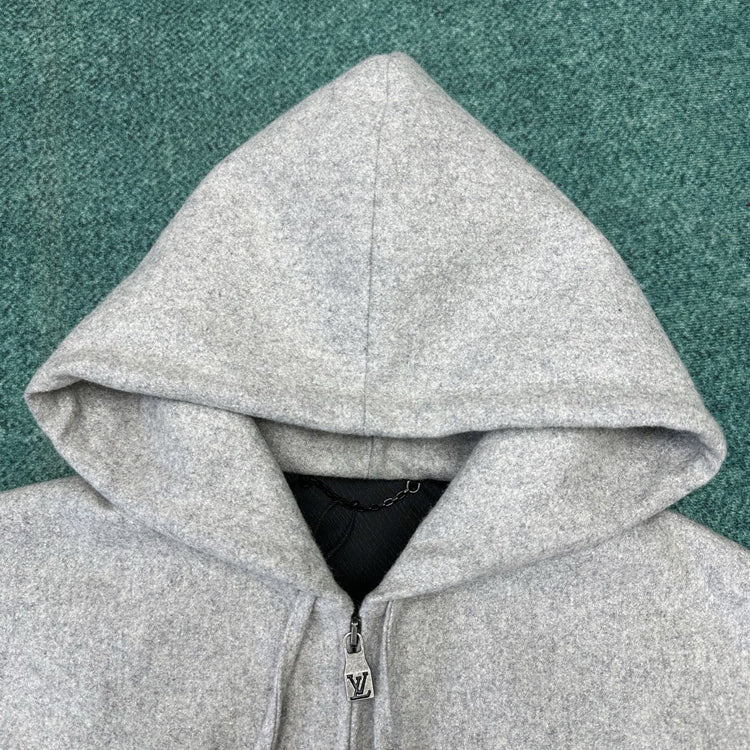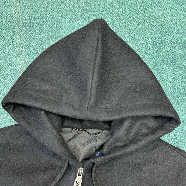 This hooded waist cinched jacket features a dynamic silhouette cut from a technology blend of sheep wool, with a gorgeous bead embellishment on the drawstring end and a metallic LV lettering on the chest. Can be paired with the same pants to showcase a fusion of elegant and leisurely style