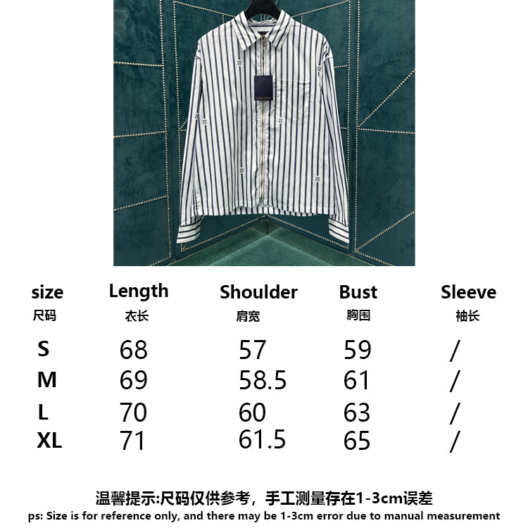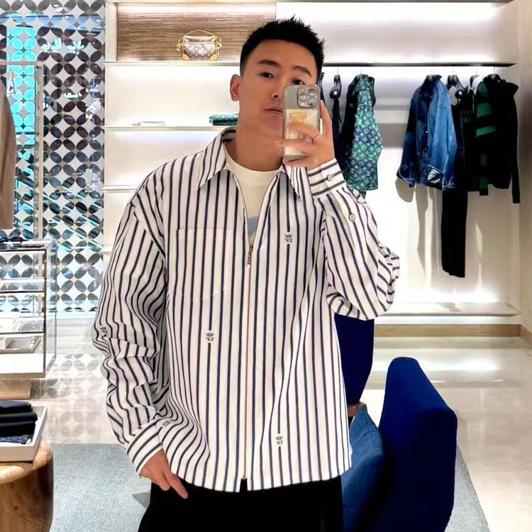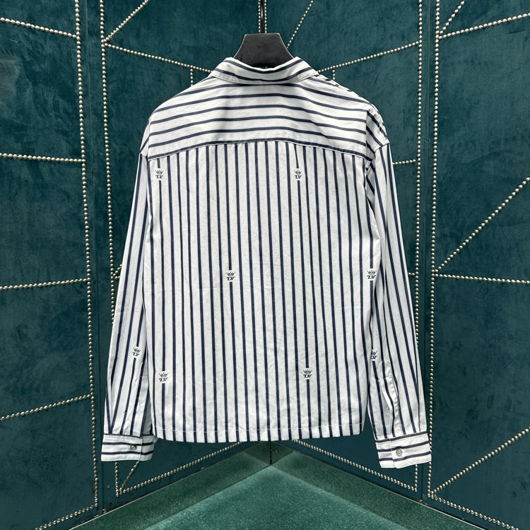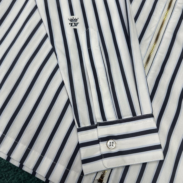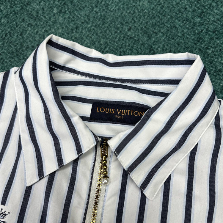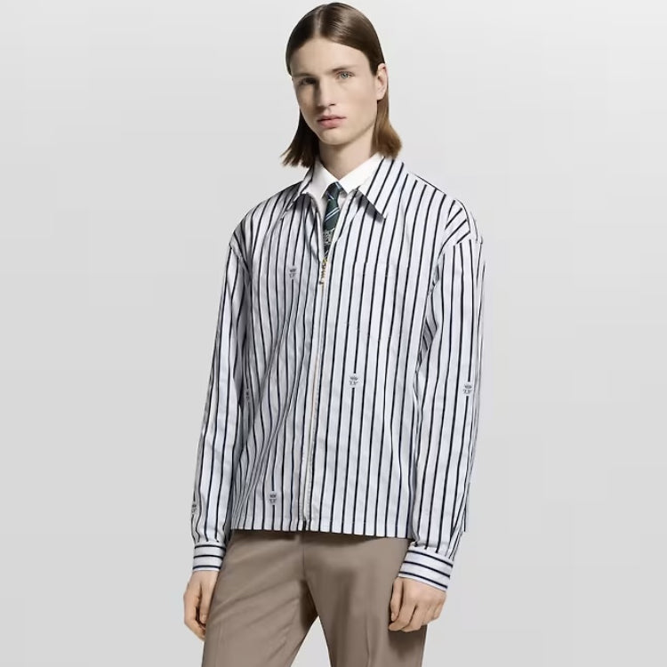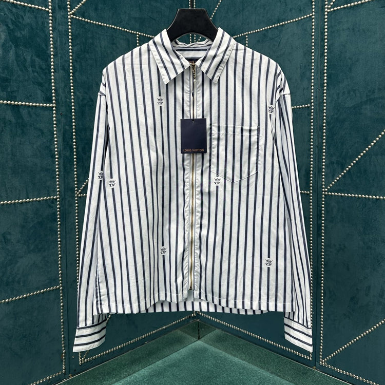This cotton shirt features a classic silhouette with a zippered front and a modern look with a beaded zipper closure. Weaving the LV Crown Stripes pattern using the cutting and jacquard technique, the miniature LV Crown logo is interspersed between the stripes, injecting an academic style into daily styling
