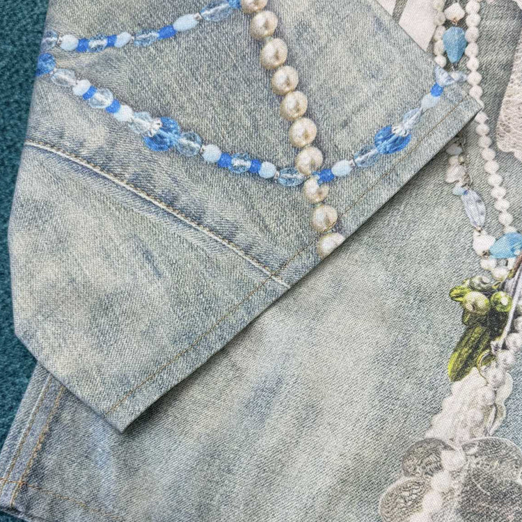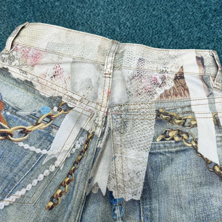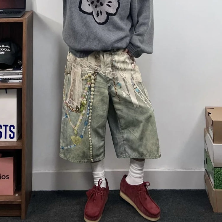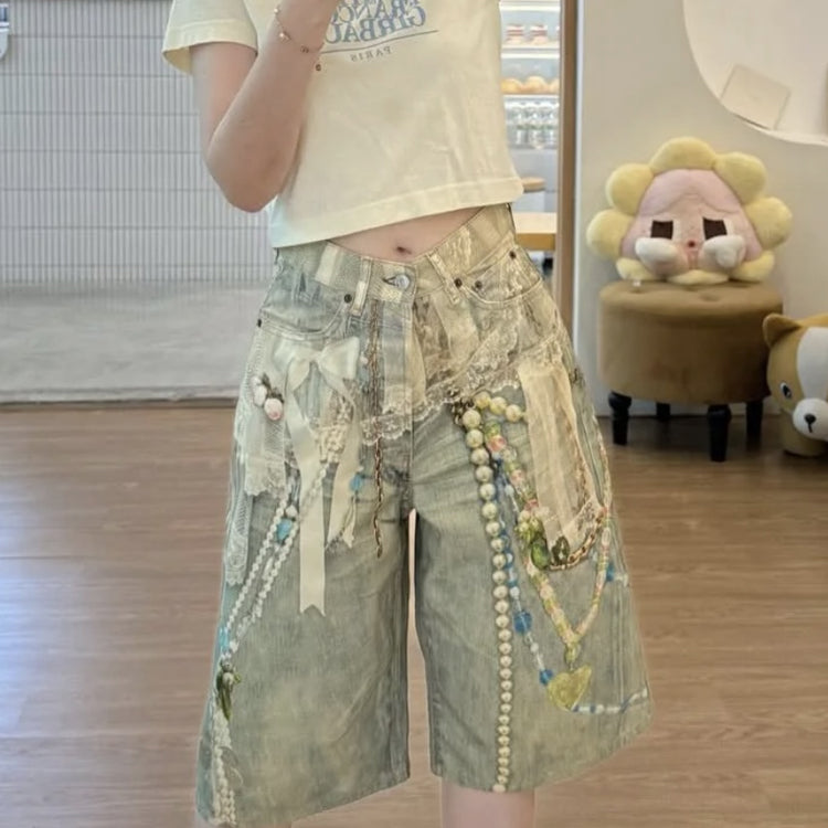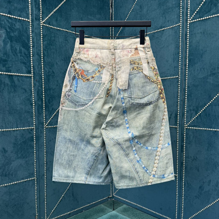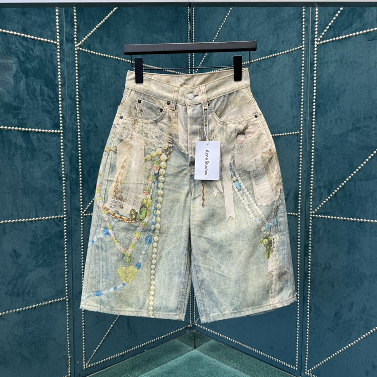 acne studios 25ss New Lace Pearl Chain 3D Optical Illusion Print Denim Shorts