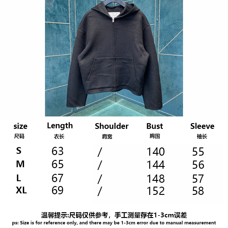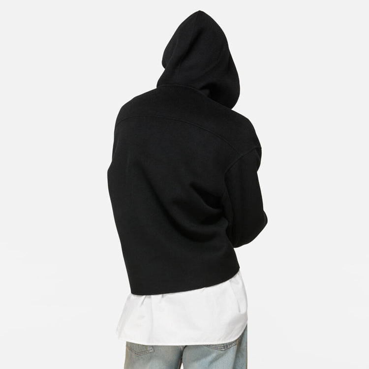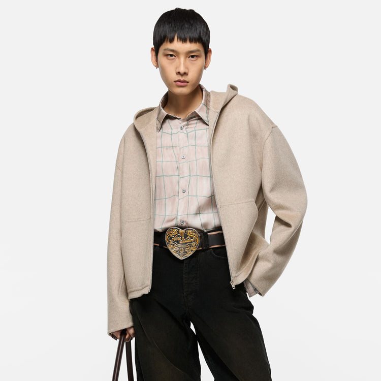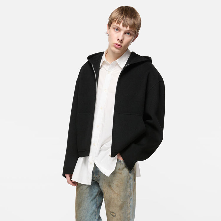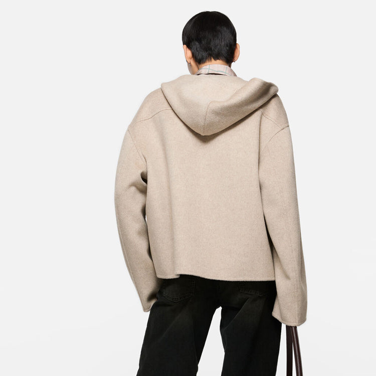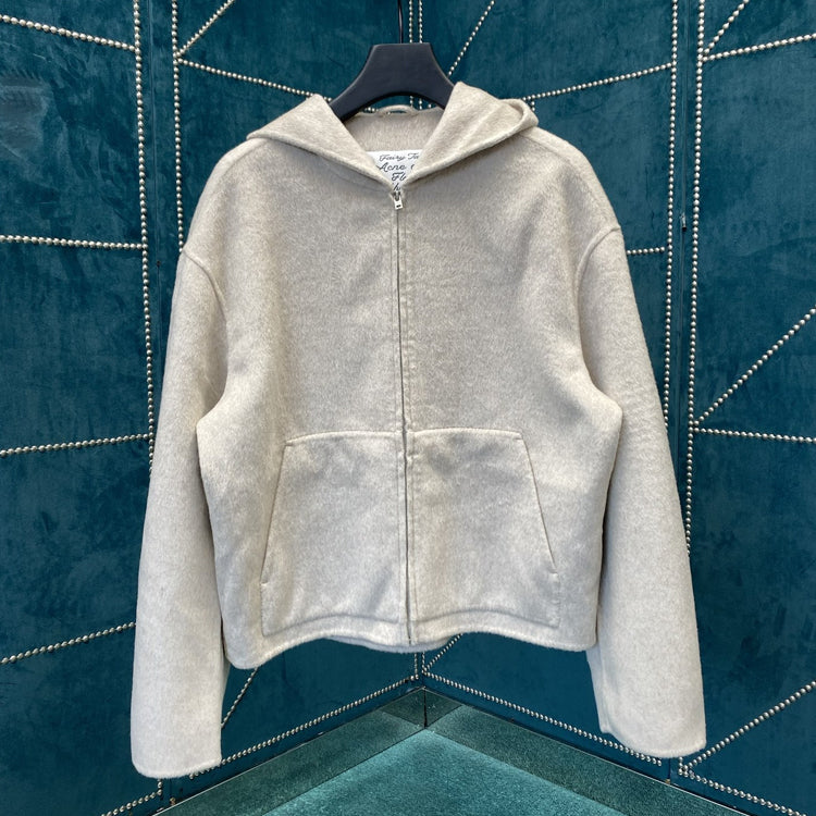 This jacket is made of soft cashmere blend fabric, with a delicate matte finish on the surface, providing an extremely soft touch. The design includes a hood pocket, front kangaroo pocket, and front zipper closure. Tailored to a loose fit, with a length up to the hips.