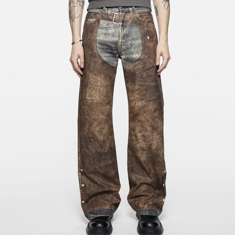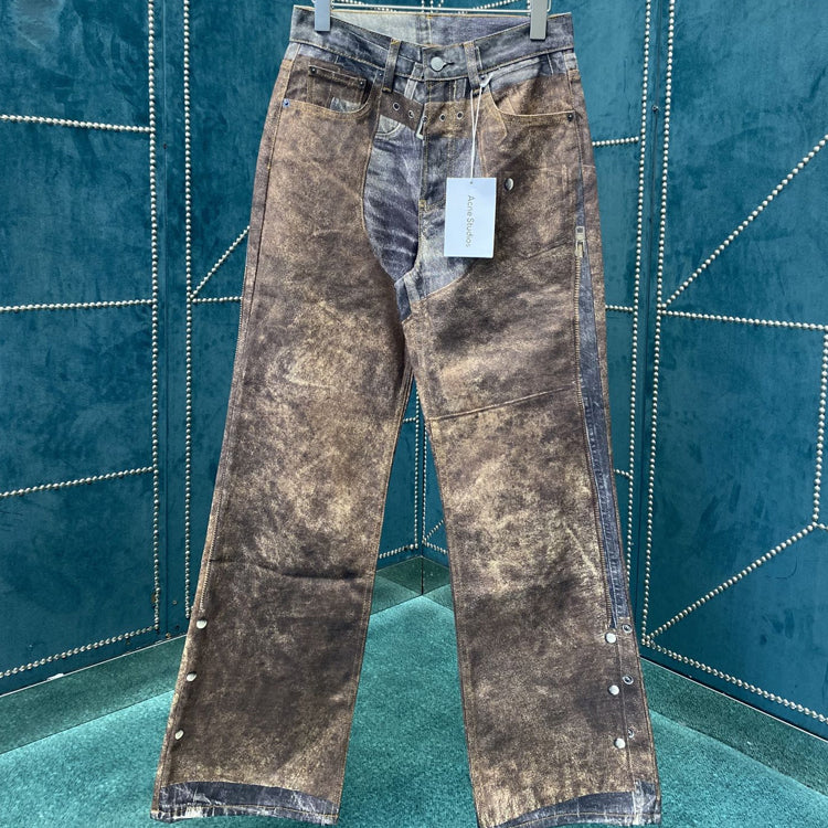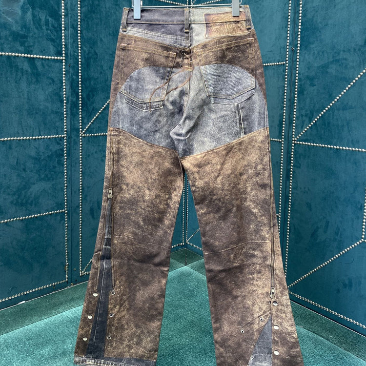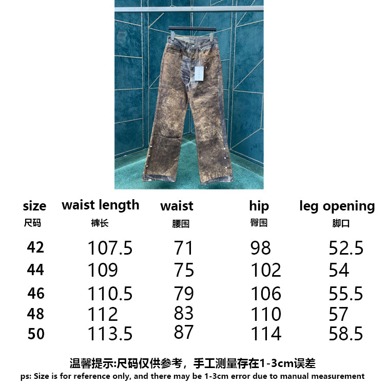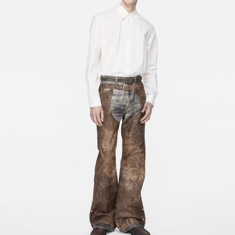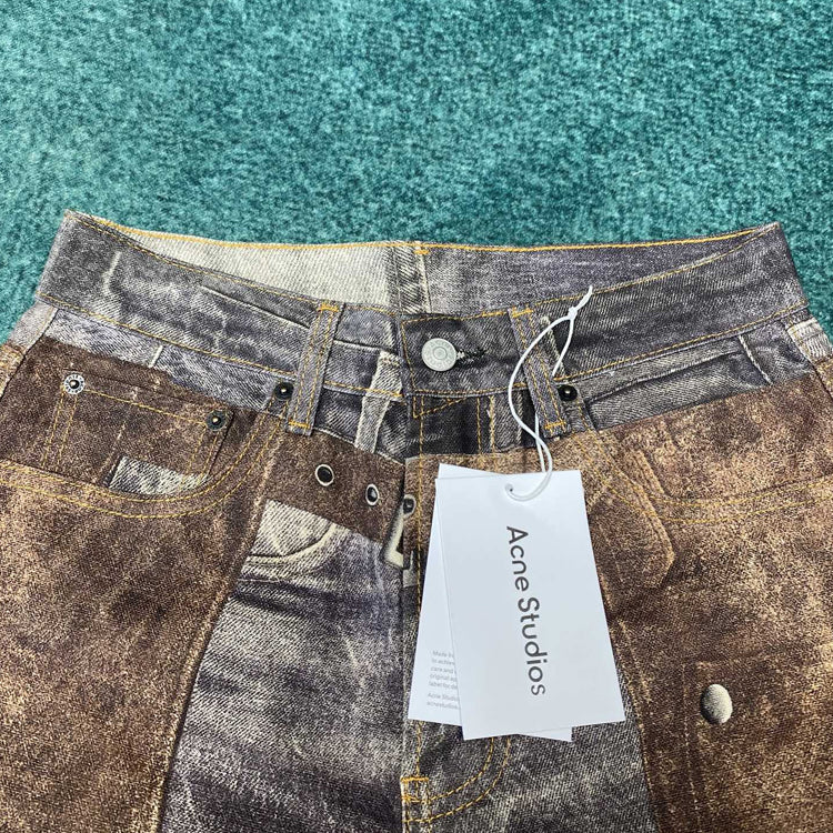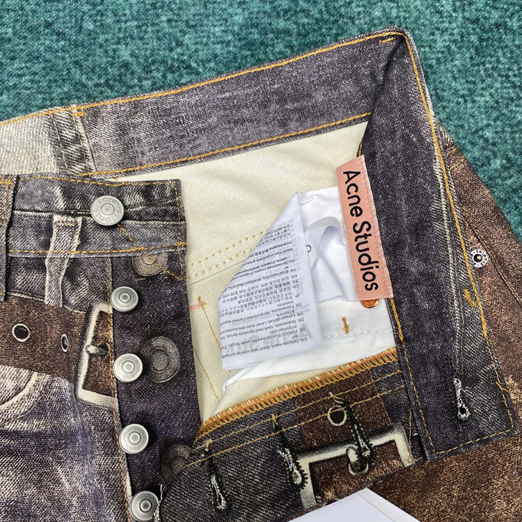 This regular version of jeans features a seasonal "deceptive visual" shorts print, made of canvas and polished for a soft touch. The cut is in a regular shape, with a moderate waist and wide straight legs slightly extending from the knees.