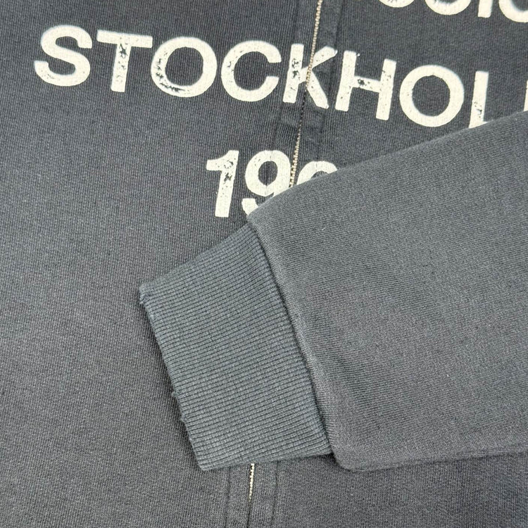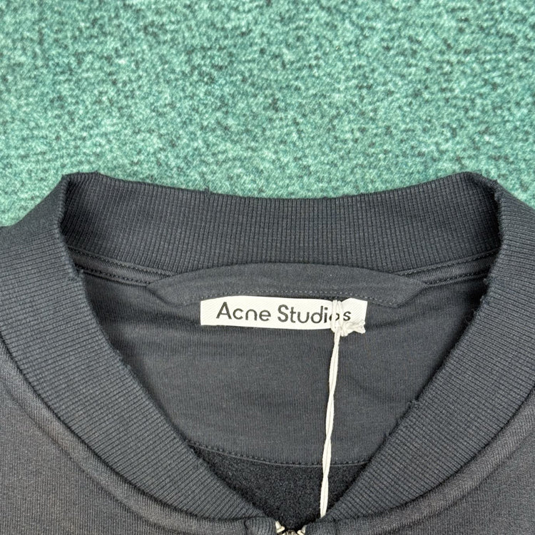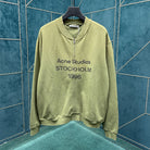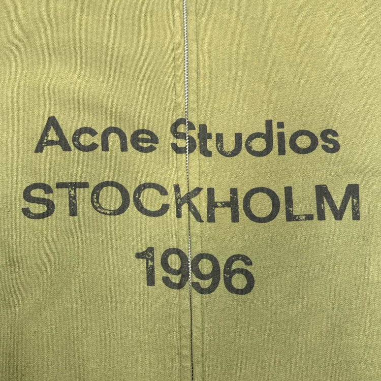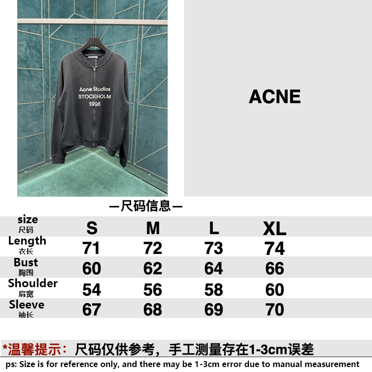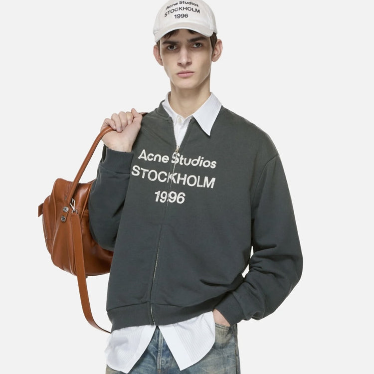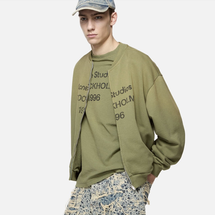 This round-neck zipper cardigan is made of cotton blended fabric, which has been treated to achieve a worn-in effect. The front is printed with the Acne Studios 1996 logo, and the neckline, cuffs, and hem feature ribbed designs, complemented by overall distressed details. It comes with side pockets and is cut in a standard silhouette, reaching below the waist.