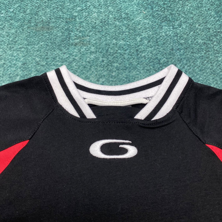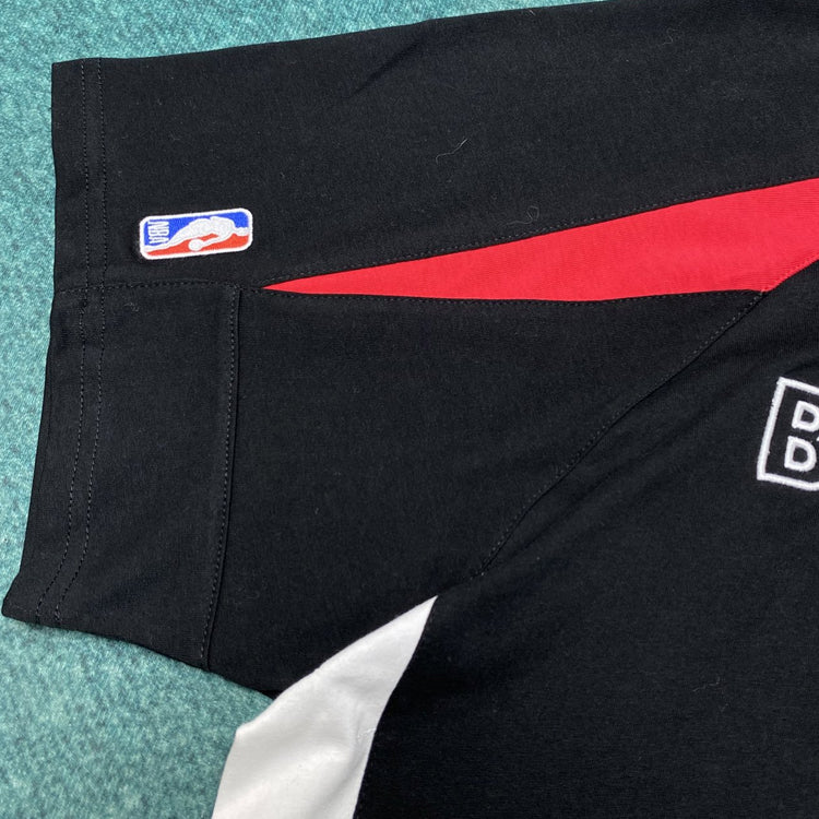 Plain knit fabric round neck embellished with contrasting color trim, contrasting color yoke short sleeved front, back, and sleeve embellishments embroidered with NBA artwork and loop sports icon artwork, created in collaboration with NBA