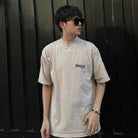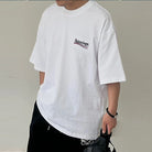Retro plain weave loose cut round neck short sleeved collar with ribbed edges, front chest and back embroidered with Political Campaign art painting
