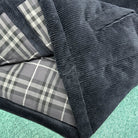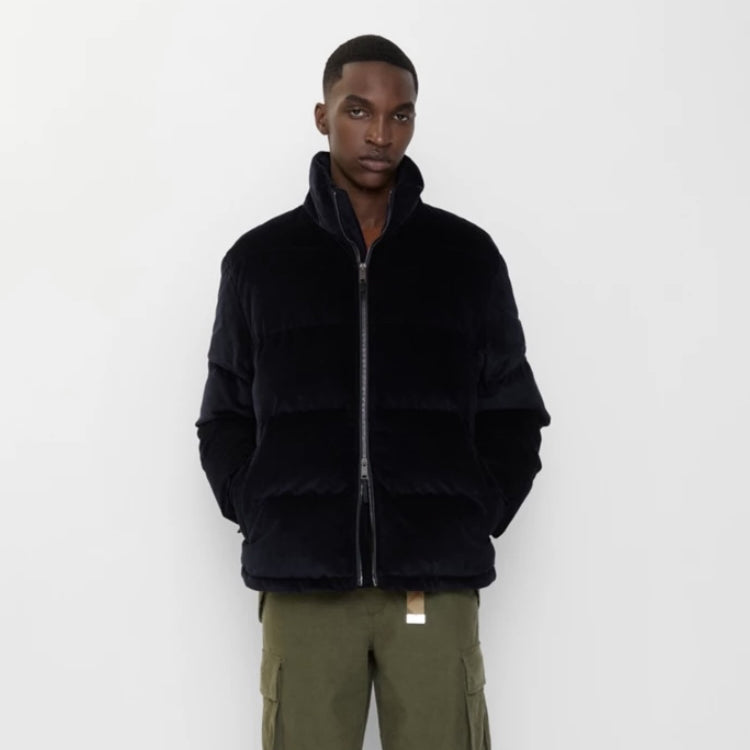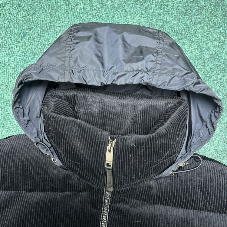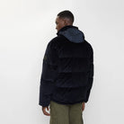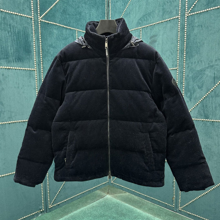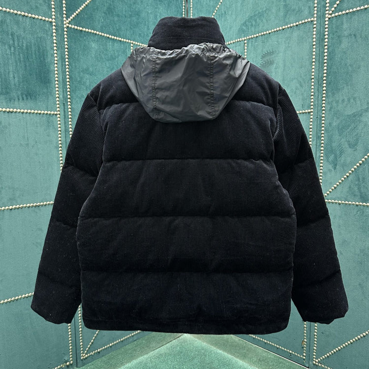Made of cotton corduroy fabric, filled with goose down and feathers. Paired with graphite grey Burberry plaid cotton lining, embellished with leather knight seal decals, featuring a collection pattern from the 1980s brand bags. Presented in a casual style, equipped with a portable nylon hood to handle weather changes with ease.