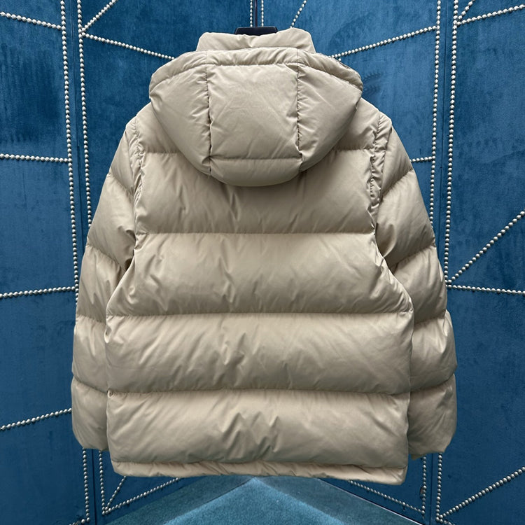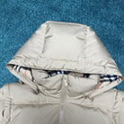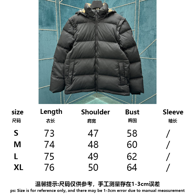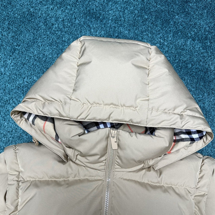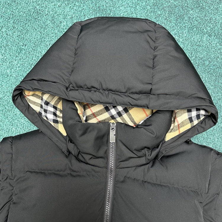 Filled with goose down and warm fibers. Decorative brand knight seal decal, inspired by vintage patterns from the 1980s. Incorporating detachable sleeve design, allowing for easy switching between jacket and vest styles. Presenting a casual style, the detachable hood and collar are paired with a wool lining, embellished with Burberry plaid.