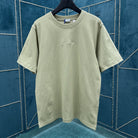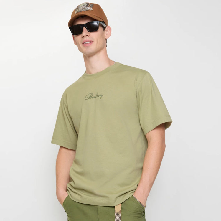 The round-neck T-shirt is crafted from medium-weight plain-woven cotton, featuring a relaxed silhouette. It is adorned with a cursive-style brand logo in Burberry tartan, incorporating chain-stitched embroidery craftsmanship.