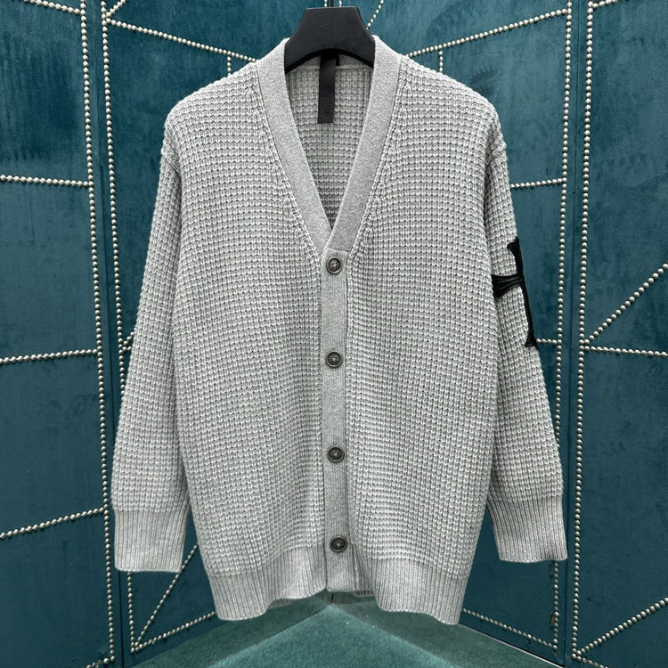 This cardigan comes with a classic brand logo. Button placket with ribbed cuffs and hem