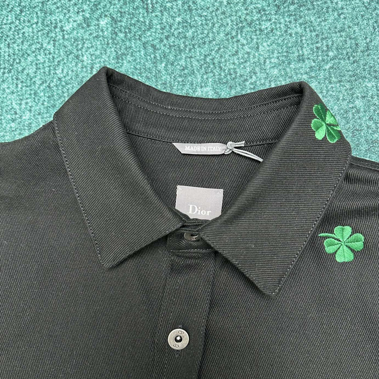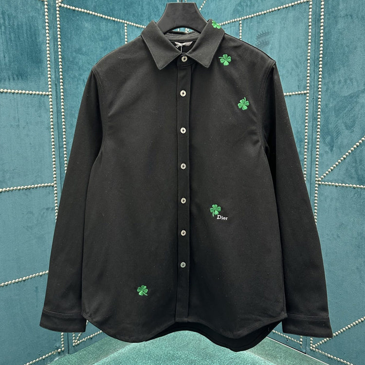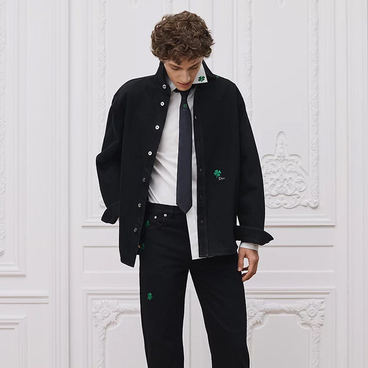 Black cotton twill fabric with Dior Clover pattern embroidery. Jonathan Anderson injects new vitality into one of the brand's classic logos and lucky symbols through the Dior Clover pattern. Crafted with black cotton twill fabric, adorned with Dior Clover embroidery and Dior leather patches. Can be paired with jeans from this series to create a classic look.