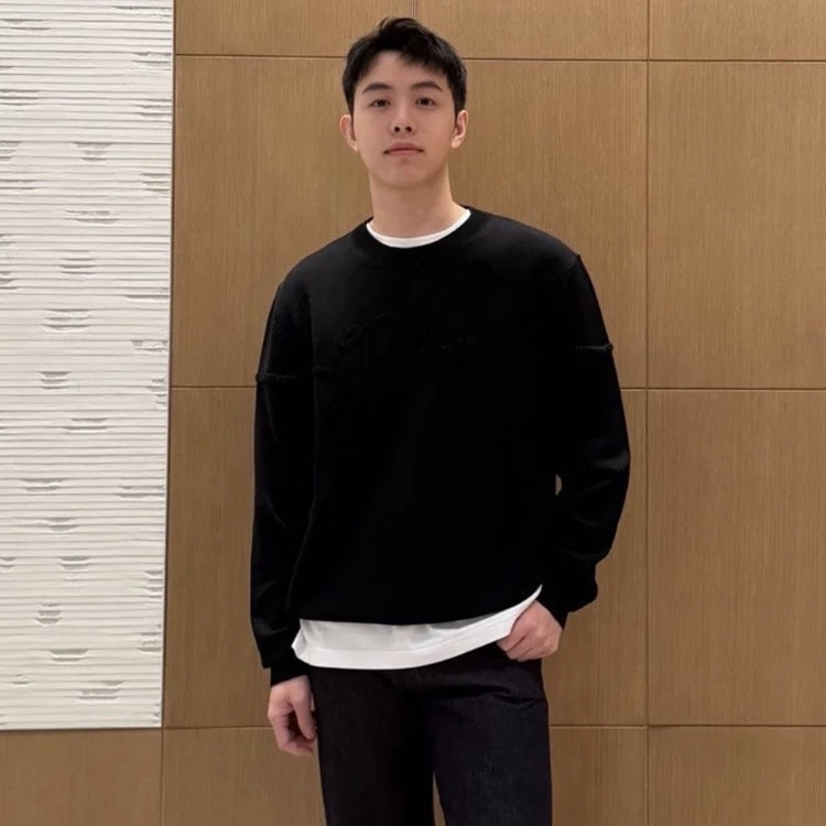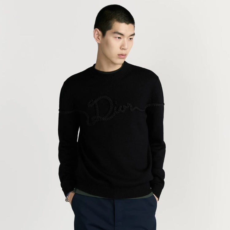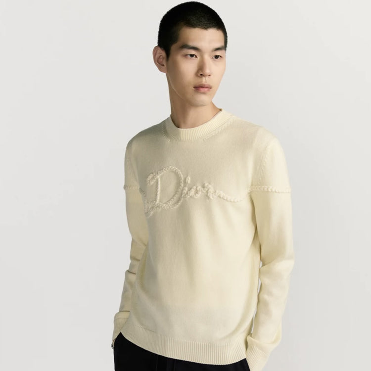 The wool plain knitted fabric with the Dior Ribbon logo is a new addition to the 2026 Spring Men's collection, adorned with the Dior Ribbon logo, paying tribute to the exquisite craftsmanship of the Dior workshop. Carefully crafted using sheep wool plain knit fabric, paired with ribbed round neck, cuffs, and bottom edge. Elegant style, can be paired with jeans to create a casual and fashionable exquisite look