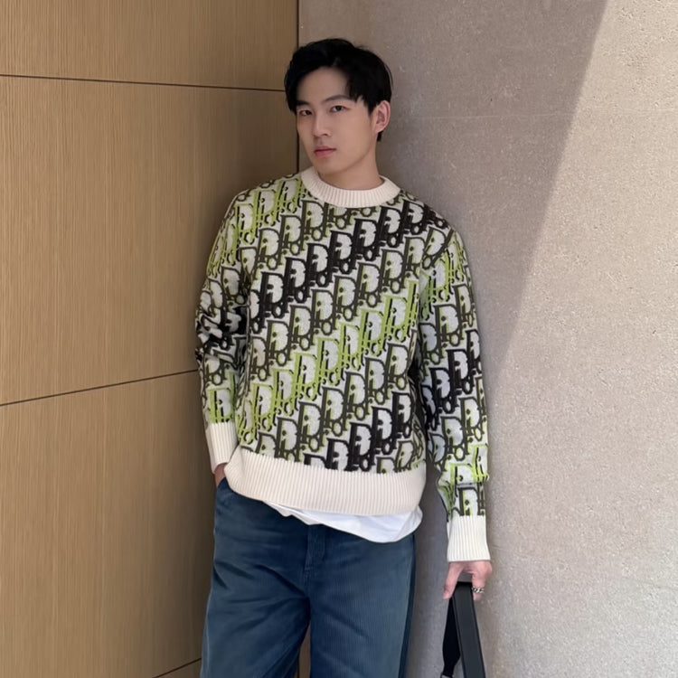The white sheep wool fabric Oblique print on this knitted sweater is a new addition to Dior's Spring 2026 men's clothing collection, highlighting Dior's classic Oblique print. Crafted with white sheep wool fabric and adorned with multi-color Oblique prints throughout, it stands out and eye-catching, paired with ribbed round neck, cuffs, and hem. The overall pattern showcases Dior's temperament, and the colorful graphic style can enhance the style of various outfits.