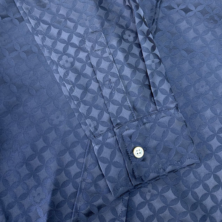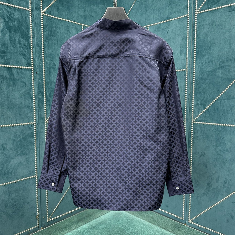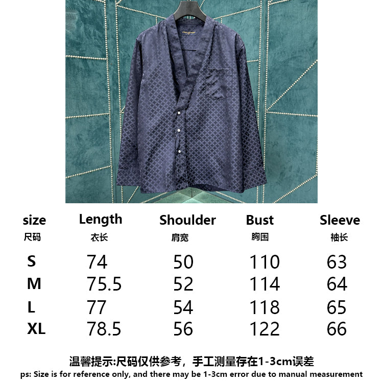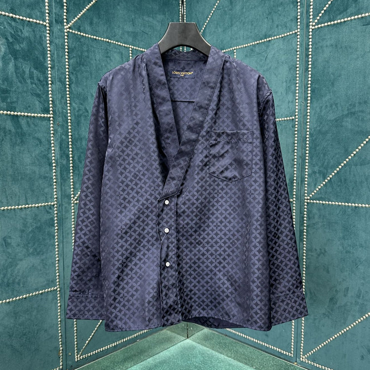 This long sleeved shirt is inspired by Pharrell Williams' 2025 autumn/winter collaboration with Nigo, paying tribute to Nigo's Japanese cultural heritage with a kimono style front. The silky jacquard fabric is adorned with Dandy Monogram patterns, and the pearl buttons showcase an elegant atmosphere. The Marque L. Vuitton D é pos é e sticker is placed behind the residence, making it easy to navigate day and night occasions