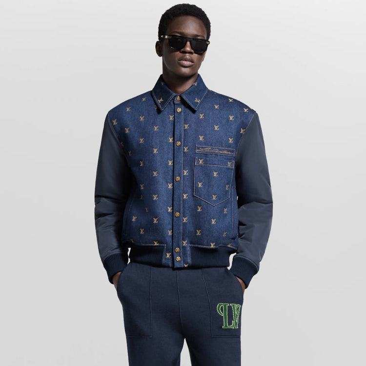 This baseball jacket cleverly revitalizes the classic men's style. The denim garment features a full embroidered LV Blason pattern, with a handwritten Louis Vuitton logo on the chest pocket indicating the brand identity. Nylon sleeves and ribbed elements collide with dynamic vitality, and the quilted lining hides clever functions that can easily cross seasonal changes